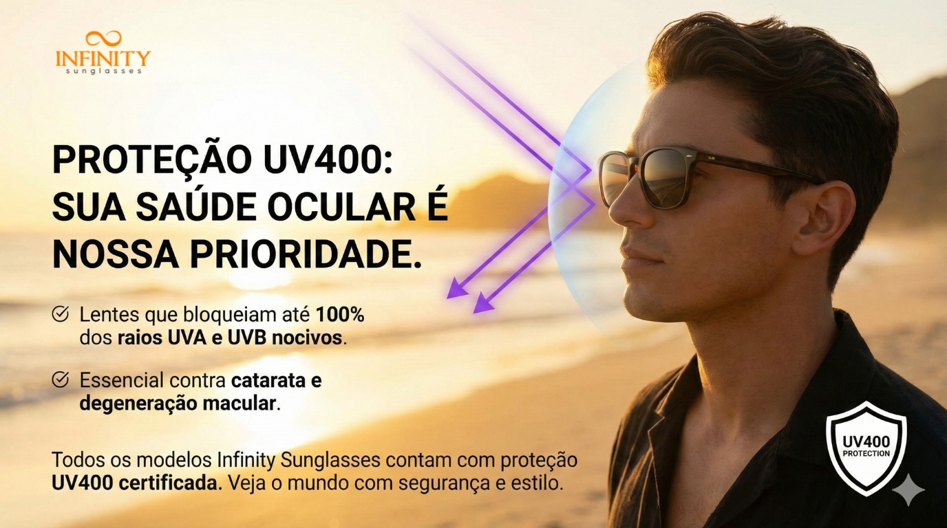 Não é apenas estilo, é saúde. A tecnologia UV400 das lentes Infinity Sunglasses funciona como um escudo total, bloqueando 99% a 100% dos raios ultravioletas (UVA e UVB). Previna o envelhecimento precoce dos olhos e garanta uma visão saudável a longo prazo.